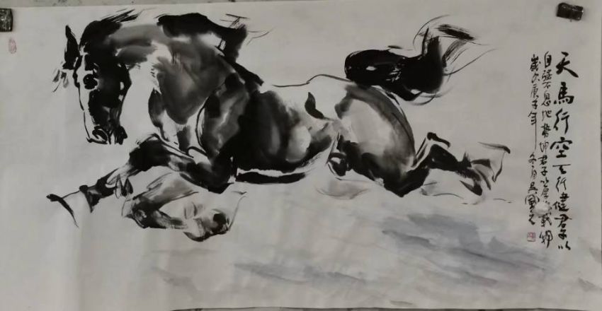 在写实的基础上,吴风之坚持大写意的手法,以草书的飞动线条入画,运用墨色的浓淡变化和空间的虚实对比渲染马的狂放飘逸和灵动神采。近年来,游遍大江南北,到过多个城市公益传授画马知识。